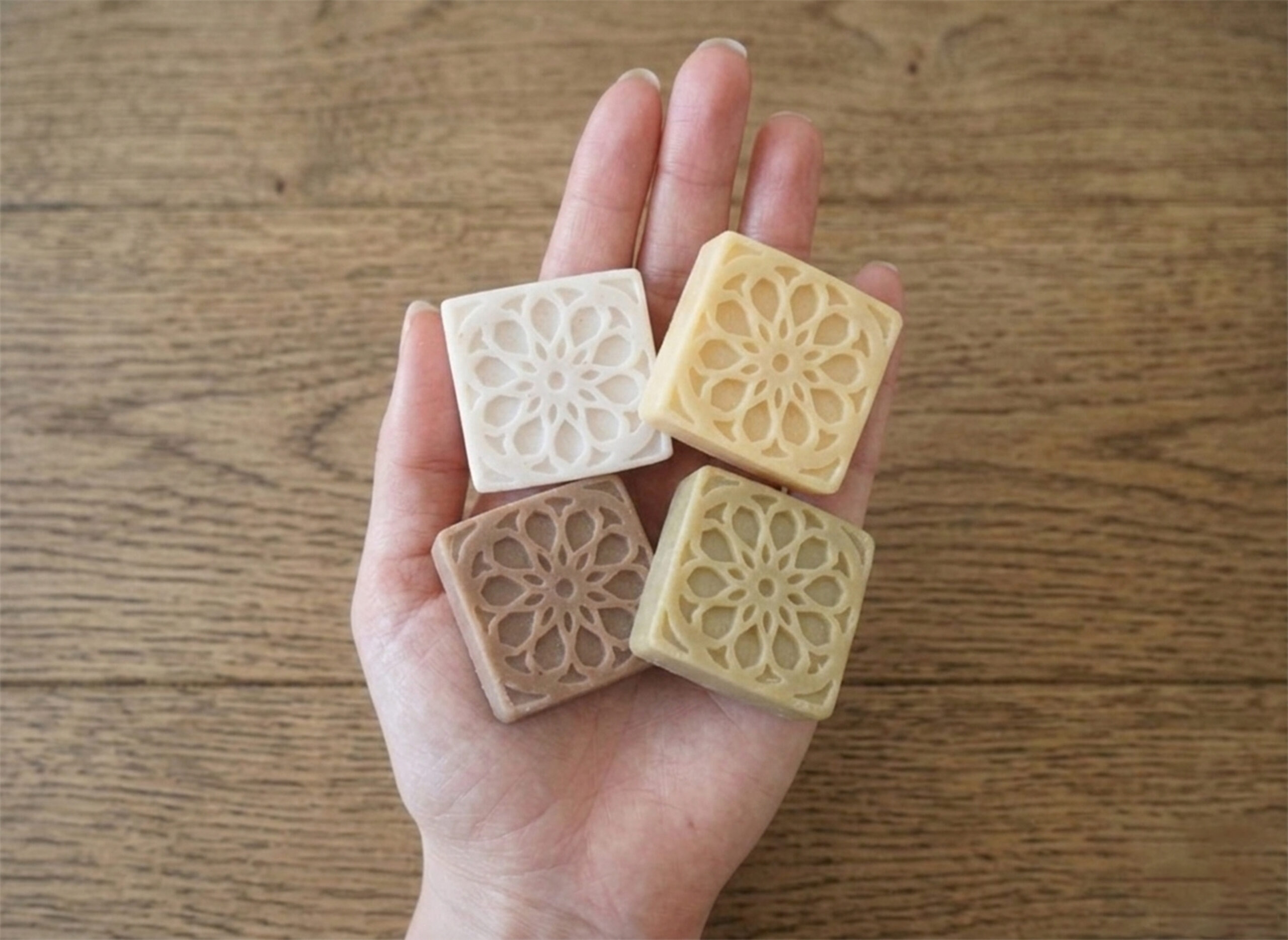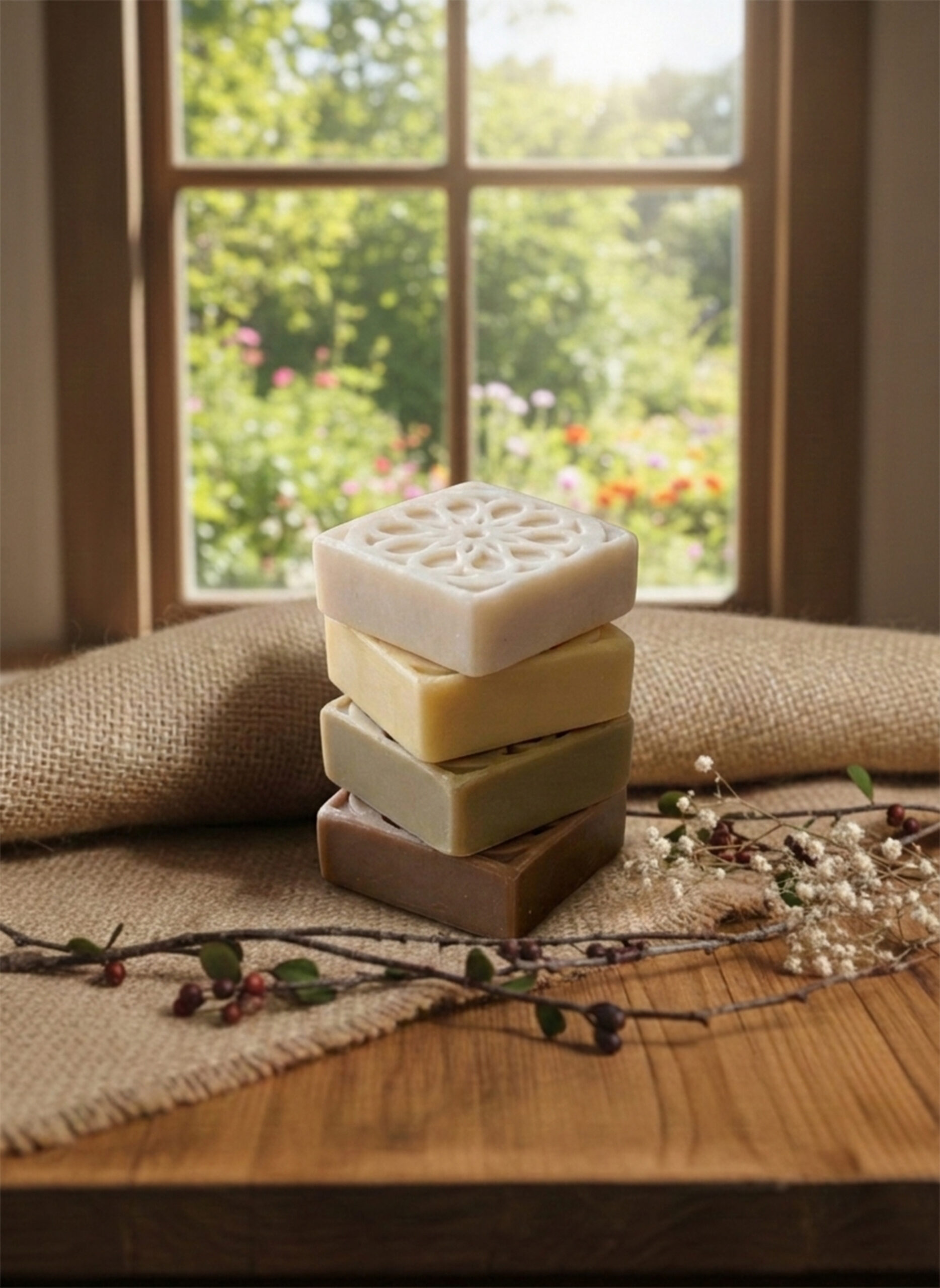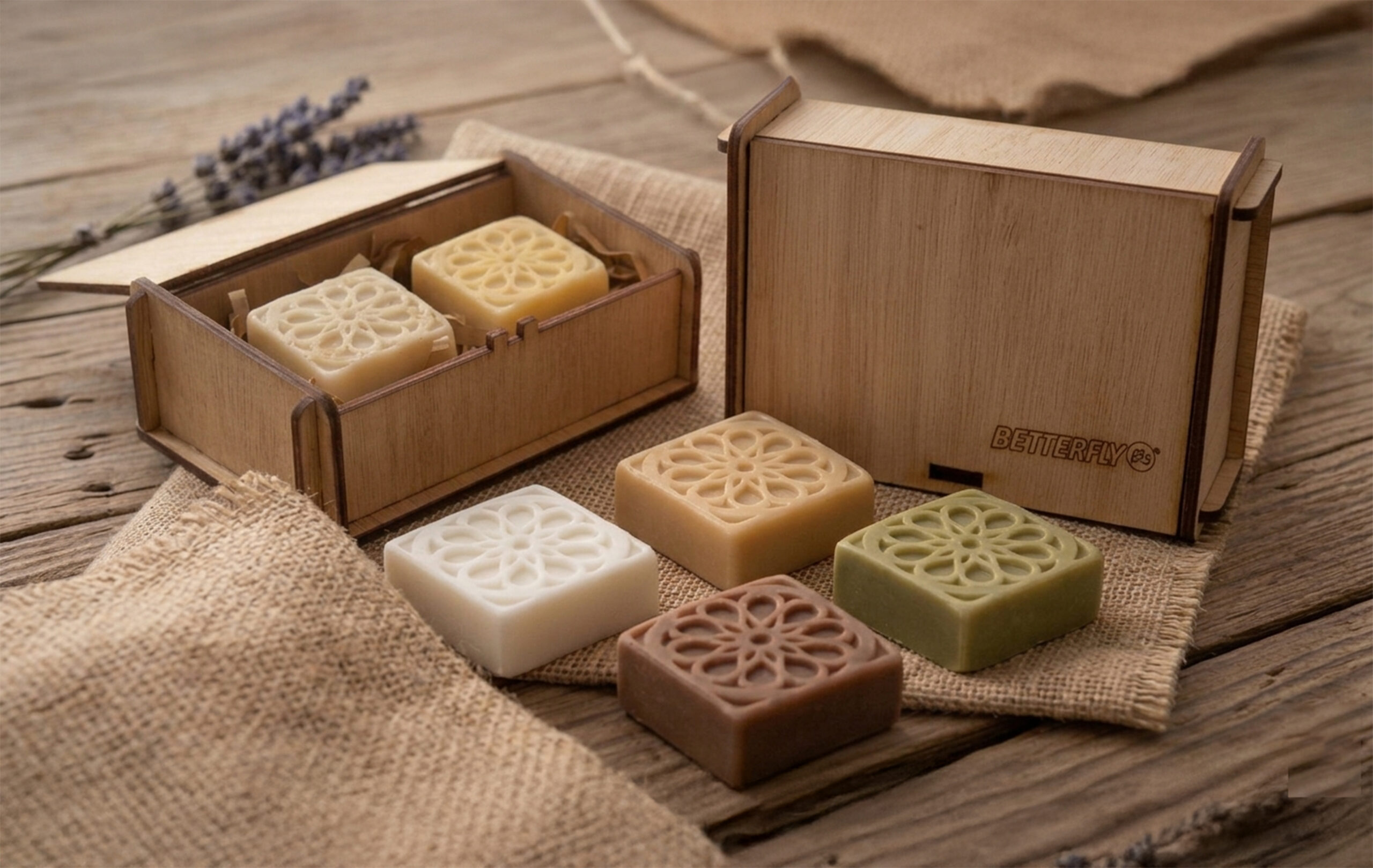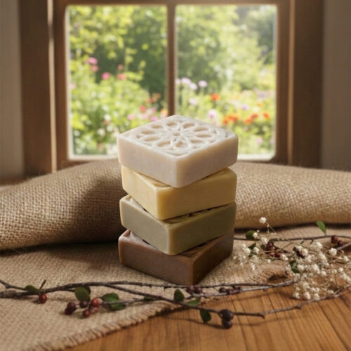 Dos jabones artesanales (40g c/u): Elaborados con aceites naturales y aromas envolventes como Chocolate-Coco o Canela-Naranja.